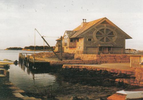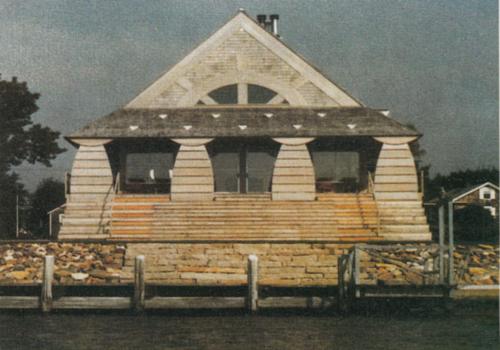 該別墅建于長島風(fēng)景如畫的歷史地段。建筑具有鮮明的后現(xiàn)代主義風(fēng)格,南面面水而建,在大大的基座上,四個巨大而豐滿的多立克柱,夸張了古典建筑符號;北面屋頂上大尺度的有輪幅的船輪成為明顯的形象標(biāo)志。