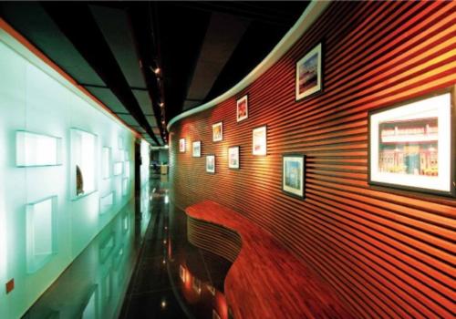 居中結(jié)構(gòu)墻體強化儲藏及展示功能,內(nèi)藏光源的毛玻璃造型可擺放各種物件, 側(cè)與多功能區(qū)隔斷蜿蜒而成“文化長廊”,遙遙相對。