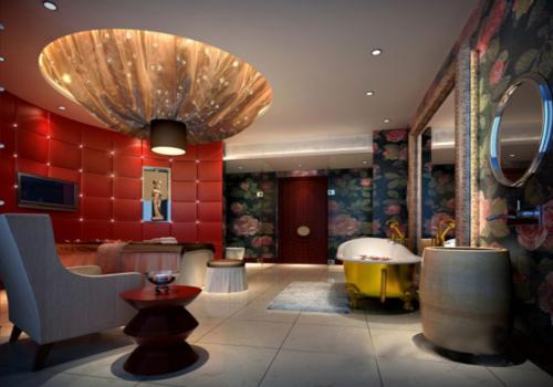 利用現(xiàn)代的科技手段讓空間形態(tài)的光、聲、色完美結(jié)合,水景珠簾蒙朧的燈光照耀下水景顯得格外生動。該美容院設(shè)計效果圖,靈動的水聲點明SPA的主題,紅色的軟包前臺背景如此妖媚,與兩對高背休閑椅遙相呼應(yīng),具有極強的視覺沖擊力。