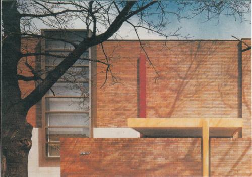 該別墅設(shè)計的建筑是現(xiàn)代主義風(fēng)格,它以鋼框架、面向庭院的兩層玻璃幕墻等現(xiàn)代主義的通用手法與鄰里建筑風(fēng)格明顯不同。沿街的立面雖然沒有傳統(tǒng)細(xì)部,但使用了街區(qū)所限用的材料,如磚石、石灰石等,用偏離中心的黃柱、垂直開的縱窗等創(chuàng)造了一種“蒙德里安”式的詩化的幾何學(xué)立面。