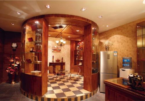 此會(huì)所設(shè)計(jì)大廳中央,放置了個(gè)展示柜,使空間看起來(lái)豐富卻不顯得擁擠。大廳的盡頭,也用木質(zhì)材料圍成了間品酒室,品酒室的墻面和木質(zhì)的地板協(xié)調(diào)致,它還是一個(gè)陳設(shè)品酒器具的展示臺(tái),晶瑩剔透的高腳杯透過(guò)透明的玻璃,向前來(lái)的客人傳達(dá)一個(gè)美好的訊息—歡迎來(lái)這里。