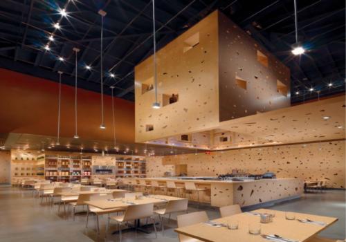 走進Toast,感覺就像走進一片面包之中,亦像在泛著泡沫的香檳酒里暢游……餐廳設計效果圖,使這個內(nèi)部世界泡沫翻涌的酵母是覆蓋所有表面的刨花板,板上打了無數(shù)不規(guī)則形狀的孔洞。