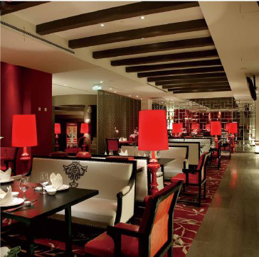 金地店采用紅竹老屋的概念,此餐廳設(shè)計(jì)大量旗幟般鮮艷的紅、隨處可見的竹影、百福影壁、盆景走廊,與現(xiàn)代簡約風(fēng)格的家具融為一體,既中式又很前衛(wèi),既雅致又不乏時(shí)尚感。