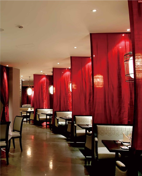 中國紅以各個(gè)形式出現(xiàn),以中國紅的布藝作為座位間的隔斷,深化了設(shè)計(jì)主題,也點(diǎn)綴了空間!