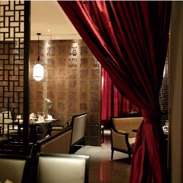 中國元素的運(yùn)用在這里有一種既熟悉又陌生的感覺:明明是工筆畫的青竹卻用了紅色;原本象征喜慶的福字壁卻用了暗色調(diào);紅色布簾與鳥籠燈組合;宮燈柱變身為高燭臺,搭配盆栽;簡約的中式窗格以夸張的比例分割和隔斷。店內(nèi)材質(zhì)主要是橡木、曲柳、石英石、夾膜玻璃。中式餐廳設(shè)計(jì),此設(shè)計(jì)案例無疑是一個(gè)很經(jīng)典的作品!