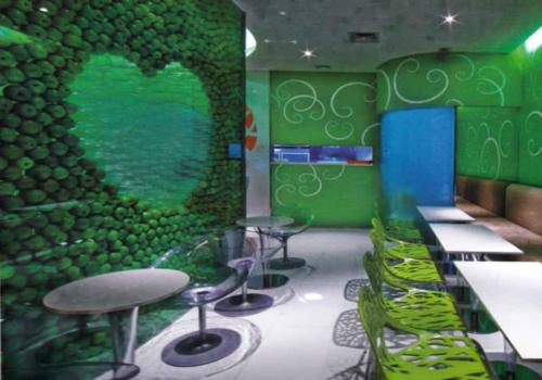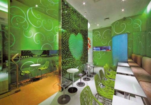 綠色襯托著由紅色與橙色組成的標(biāo)志。綠色的青蘋(píng)果通過(guò)懸吊、堆疊的方式組成了主墻面與屏風(fēng),青蘋(píng)果屏風(fēng)中間還有一個(gè)透明的心形,浪漫溫情呼應(yīng)著logo的寓意。