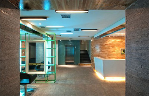 此SPA設(shè)計(jì)案例接待及洽談區(qū)部分使用了水曲柳實(shí)木裝飾墻面,在兩個(gè)區(qū)域間加入玻璃隔墻,既能劃分出相對安靜的洽談空間,又保證了視覺上的通透感。