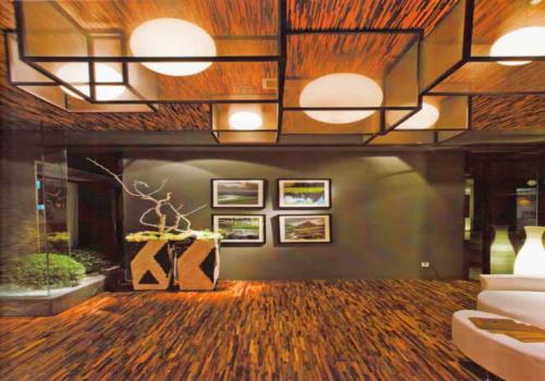 一條自上而下像一條抖動(dòng)的床單一樣的木馬賽克長條桌椅,可以反映出設(shè)計(jì)師的藝術(shù)功底。設(shè)計(jì)師用瀟灑的筆法任由木馬賽克在燈光的照射下,虛實(shí)相間。