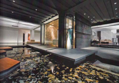 進(jìn)門廳的深灰色從外墻的橫條裝飾延伸進(jìn)來,強(qiáng)調(diào)室內(nèi)外的統(tǒng)一。蘇式水景是此展廳的一大特色,不規(guī)則的多邊形木板及石塊造型讓人驚嘆。如此創(chuàng)意的設(shè)計(jì),是對鄭州裝修公司項(xiàng)目設(shè)計(jì)的一次沖擊。