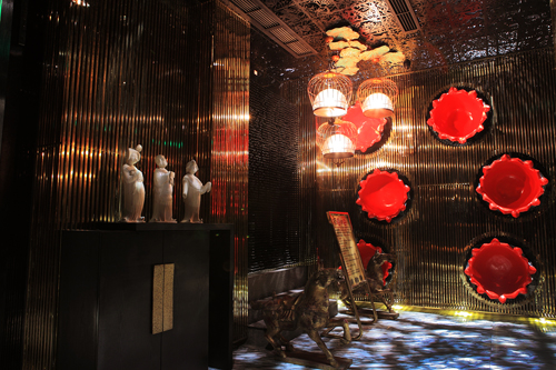 此會所設(shè)計頂?shù)奶幚砩喜捎萌诘淖龇?,目的是想把頂?shù)母拍钐摶?,鏤空十二生肖圖,光源全部隱藏在頂?shù)纳喜?,投射出斑斑駁駁的光斑.