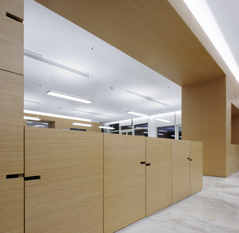 此辦公室設(shè)計(jì)案例設(shè)計(jì)師為了增加親切感,設(shè)計(jì)師在空間放置了幾組很有秩序的木色辦公柜,立于辦公區(qū),包住了空間中的柱子。柜子與頂交接處用燈光脫開,使柜子感覺是不到頂?shù)?,這樣讓整個辦公區(qū)的頂是貫穿的,感覺上更加開放和寬敞。