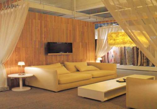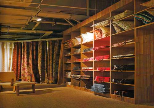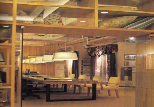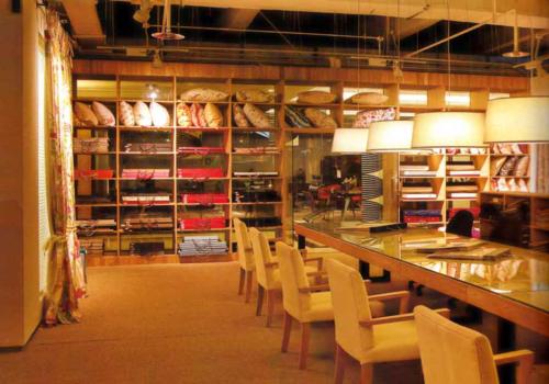 商鋪空間格局呈開放式設(shè)計(jì),不作通常意義上的情景再現(xiàn)式的場景布置。接待工作區(qū)及背后的洽談休息區(qū)被設(shè)置在店鋪的中央,周圍墻面相應(yīng)成為各種布藝產(chǎn)品的展示區(qū),節(jié)奏清晰,又互為背景。