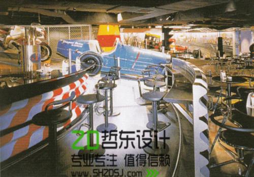 例如北京滾石餐廳(HARD ROCK CAFE,BEIJING)。這家美式餐廳的最大特色和主題就是餐廳內(nèi)布滿各種與搖滾音樂(lè)有關(guān)的裝飾擺設(shè)。該餐廳分店遍布世界各地,深受客人的喜歡,首間滾石餐廳于1971年在倫敦開(kāi)業(yè),一直延續(xù)同一種裝飾風(fēng)格,成為主題餐廳的典范。北京滾石餐廳中有一供現(xiàn)場(chǎng)演奏的舞臺(tái),舞臺(tái)背后鑲有三幅著色落地玻璃,玻璃上繪有西方著名搖滾樂(lè)手的肖像,燈光從玻璃背后放射光芒。設(shè)計(jì)師利用空間高的優(yōu)點(diǎn),在天花中飾以一幅大型彩繪裝飾畫,畫有歐美搖滾樂(lè)隊(duì)的肖像,可見(jiàn)披頭士樂(lè)隊(duì)、滾石樂(lè)隊(duì)站于天安門及長(zhǎng)城之前。加之餐廳內(nèi)的地板,墻壁及家具均采用木材,更能突出餐廳內(nèi)的各式擺設(shè),點(diǎn)明了餐廳的主題。