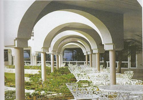 連續(xù)的拱券柱廊形成強(qiáng)烈的韻律感,配以白色的桌椅及綠化,使環(huán)境十分優(yōu)雅、愜意!