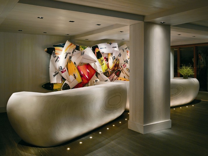 一間巨石酒吧由天然的巖石搭建而成,洗浴中心的天花板上嵌著不規(guī)則的燈泡。夜總會(huì)內(nèi)舞池四周環(huán)繞著漂白處 理過的座位席,室內(nèi)裝飾全部使用天然的原材料,目的是為了營(yíng)造一種原始質(zhì)樸的氛圍。