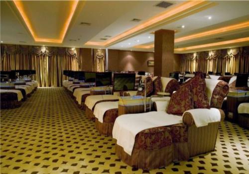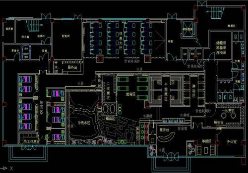 洗浴中心設(shè)計與裝修著重外表的,視覺藝術(shù)的角度,指建筑內(nèi)部固定的表面裝飾和可以移動的布置,所共同創(chuàng)造的整體效果。如偏重與室內(nèi)地面,墻面,天花等界面的藝術(shù)處理,也涉及門窗,墻壁,天花板等固定裝飾和家具,簾幔,地毯,燈具,陳設(shè)和室內(nèi)綠化等可移動的布置和裝飾。下面是一側(cè)洗浴中心設(shè)計實例平面圖及效果圖欣賞: