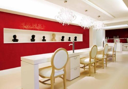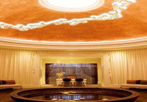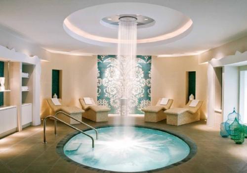 厲家棕櫚海濱酒店水療會(huì)館設(shè)計(jì)中色彩方案的靈感來(lái)源于土、水、火和冰,這種感官理念應(yīng)用于療養(yǎng)室的設(shè)計(jì)中(通過(guò)變色led燈得以實(shí)現(xiàn)),同時(shí)也用于12個(gè)私人花園別墅、更衣室和桑拿房、蒸汽房、帶有加熱躺椅和中央噴淋水景的公用浴室、美發(fā)美甲沙龍、健身中心,以及一個(gè)帶有銅襯水池的圓形拱頂大廳。