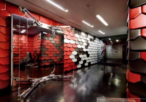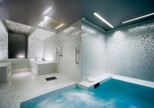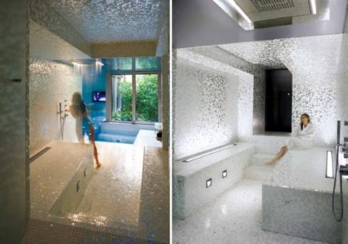 ?。穑颍椋觯幔簦濉。螅穑嵝蓍e會(huì)所設(shè)計(jì)天花板吊頂采用了銀色乙烯基材料,懸掛于隱藏的軌道上,將周圍墻壁連接起來。燈光效果突出了鑲嵌于天花板、地面和墻壁上的馬賽克的富麗堂皇,使整個(gè)房間看上去如同精美的首飾盒。精選的馬賽克由明暗相間的小塊組成,其中一些是由兩層玻璃和24K白金薄片夾層制成的。該空間由光線和水兩種基礎(chǔ)元素組成,是放松身心和養(yǎng)生的奢華場所。