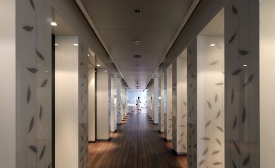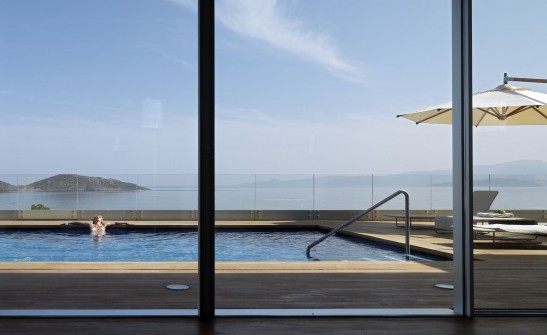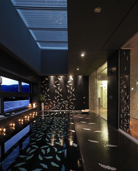 克里特島厄勞達(dá)酒店水療健身中心內(nèi)部空間,以“輕”材質(zhì)的使用為主要特征,如天花板和墻壁都采用玻璃以及半透明的面板材料,創(chuàng)造出一個(gè)平靜安詳?shù)目臻g,視覺上有反射的效果,周邊的景觀則是這個(gè)空間的主要顏色基調(diào),色調(diào)上唯一例外的是,黑色大理石和其中被印刷了的玻璃。