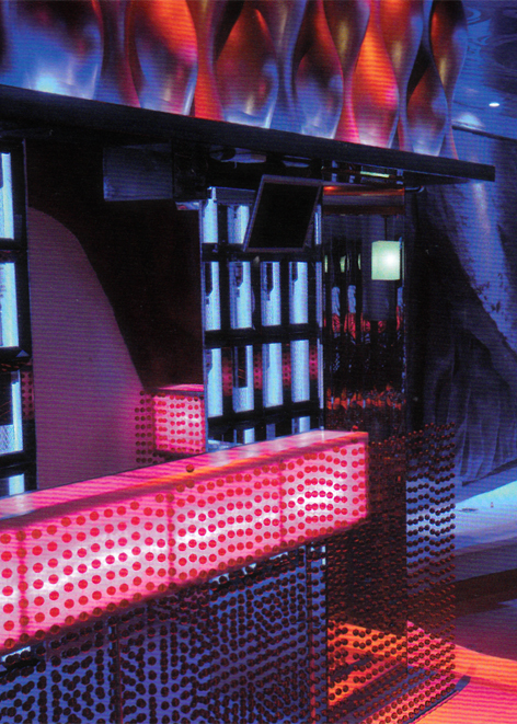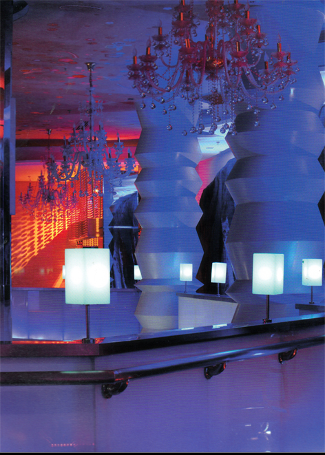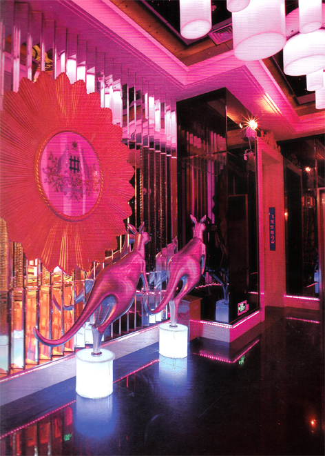 極具特色的佛山龍會娛樂城、是一家擁有五十幾間包房和一個慢搖吧的高檔娛樂場所。設(shè)計師在一個娛樂經(jīng)歷中發(fā)現(xiàn)男女跳舞的舞蹈動作很像一只只站立或奔跑的袋鼠尤其是兩只搖擺的手。于是靈感勇現(xiàn),創(chuàng)作了龍會娛樂城以袋鼠為主要裝飾元素的娛樂空間,以跳躍中的袋鼠形象營造出自由奔放的氣氛,讓人印象深刻難忘。在璀璨的紫紅色燈光裝點(diǎn)之下,設(shè)計師成功地玎造了一個夢幻王,華麗而不失動感奔放。