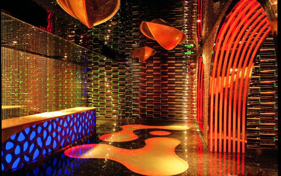 夜場(chǎng)設(shè)計(jì)緊貼賓客的消費(fèi)心理,以鏡面不銹鋼、灰鏡及LED燈等為主材,創(chuàng)造了一個(gè)光怪陸離的時(shí)尚娛樂(lè)空間,獨(dú)特的理念帶來(lái)了非一般的感官體驗(yàn),讓你每時(shí)每刻都有全新發(fā)現(xiàn)。墻面上各異的圖案順著天花灰鏡向上攀爬,黑金砂地面上異形的發(fā)光帶肆意流淌,妖嬈的珠簾在流光中炫出五彩的媚影,恍惚間,竟不知是行于地上,還是浮在星際,仿若墜入一張異度時(shí)空的網(wǎng)中,驚喜交加,欲罷不能。這就是,惟有金爵俱樂(lè)部才能給到你的迷離心情。