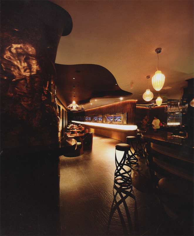 氛圍的營造上設(shè)計師的靈感來自于沙漠中的阿拉伯宮殿,娛樂是很多地方都相通的,這個夜總會設(shè)計仿佛是沙漠里的天堂,帶給人愜意和歡樂。設(shè)計師在燈光的運用上吸取了光學原理,以內(nèi)部大量的鏡面產(chǎn)生相互折射達到了一種非常迷離的效果。
