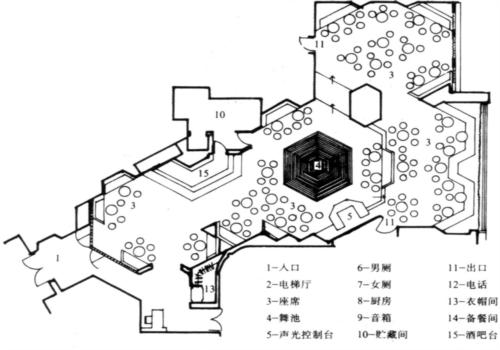 a、夜總會(huì)歌舞廳舞池與休息區(qū)一般采取高差的方法來分隔,舞池一般略低于休息區(qū),休息區(qū)一般圍繞舞池而設(shè),演奏臺(tái)一般略高于休息區(qū)和舞池。
