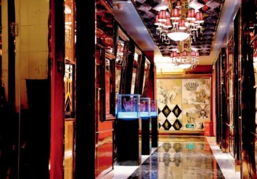 橙色的燈光一一亮起,隨處可見的似有若無的玻璃泡泡,頂面軟包和鏡子的混合,大塊包框斜面的鏡子,大量亮光鈦金的運用,黑色和紅色絨布的巧妙對比,空間上的層疊交錯,使人產(chǎn)生迷離夢幻的感覺,在其奢華和高貴的背后,依然充溢著一種奇妙的設計張力。