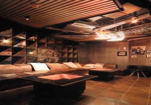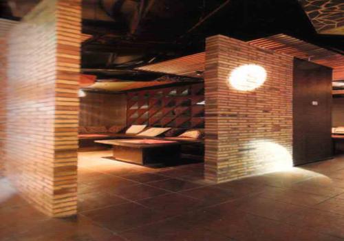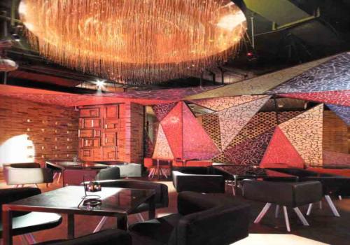 天花及墻身以現(xiàn)代感很強(qiáng)的不規(guī)則三角形圖案構(gòu)成造型,與地面的不等式,黑金屬及馬賽克圖案相呼應(yīng),讓客人置身其中,有目眩之感。
