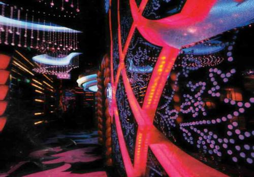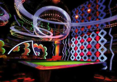 包房?jī)?nèi)、走廊內(nèi)使用條紋造型發(fā)光燈糟,讓人聯(lián)想起甲殼蟲(chóng)樂(lè)隊(duì)喜歡穿的演出服,雙邊菱形是貝克漢姆的球衣、“英寶”商標(biāo)等等。