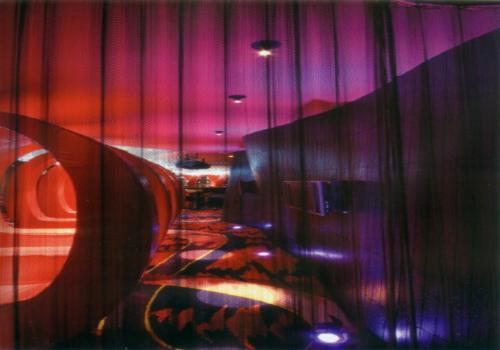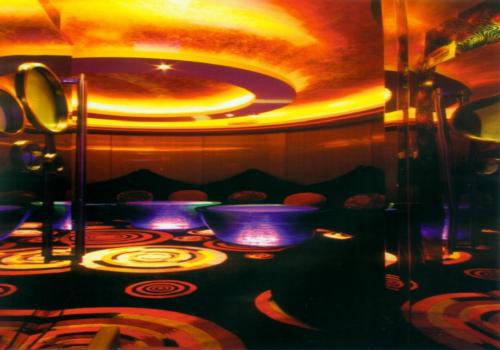 設(shè)計(jì)師將冷暖色彩、曲線墻飾、動(dòng)感的藝術(shù)圖案地毯與萬千的燈光變化結(jié)合在一起,把各樓層統(tǒng)一為紅色基調(diào)。