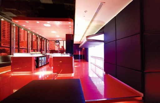 “Salle?。睿澹椋纾?rdquo;大廳貫穿上下兩層空間,兩側(cè)擺放有休息躺椅。床后面掛著薄紗簾,紗簾上下都以LeD燈進(jìn)行照明,使空間看上去如同首飾盒,并給人一種溫馨的感受。來到“胭脂吧”可以看到吧臺島和一個(gè)沿玻璃幕墻萬向擺放的黑色皮質(zhì)沙發(fā),玻璃幕墻采用紅色,自然地成為了“胭脂吧”的部分。