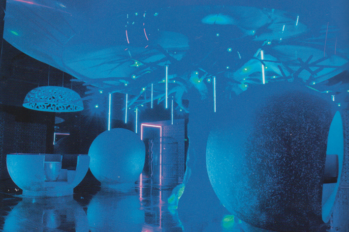 “鳳舞九天”是此會所的主題,標志噬的“鳳”貫穿整個會所。大門上高懸的夜會LOGO醒目且優(yōu)雅, ‘鳳“的形象生動別致,周匡素凈的LE0燈飾更是襯托生LOGO的靜謐感。人造的蛛絲網上懸掛著如同破碎蛋殼的飾物。人站在下面總會擔心那蛛絲網不夠結實,但并不會真的為此擔心,這些人造的蛛絲絕對安全。