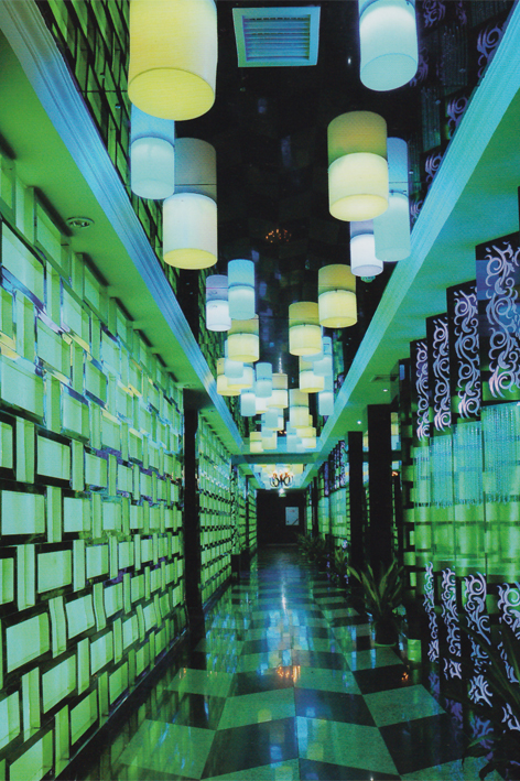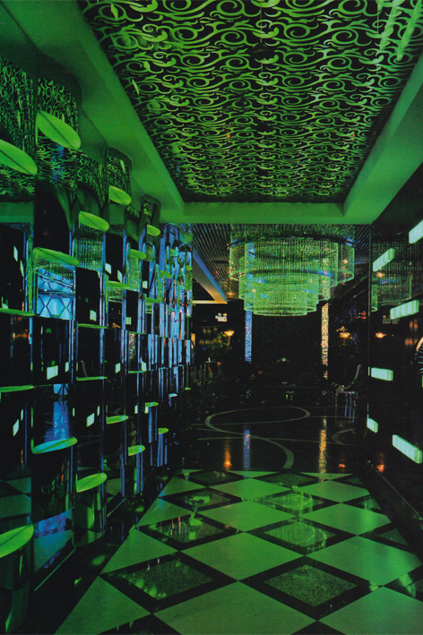 設(shè)計(jì)主要以藍(lán)、綠、紅調(diào)為王,利用不同的材料來襯托,如大理石、不銹鋼、特種布藝等,再配以“LED燈光,營造出奢華浪漫的氛圍。夜場設(shè)計(jì)中使用了大量歐式和現(xiàn)代的元素,墻壁上的時(shí)尚壁畫,處處流露出貴族的氣質(zhì)和品味。燈上的珠簾如瀑布般隨著燈光直傾而下,宛如生命的律動。功能齊全的休閑、娛樂場所,彰顯個性的空間,所有的美結(jié)合在一起,讓你忘記一切。