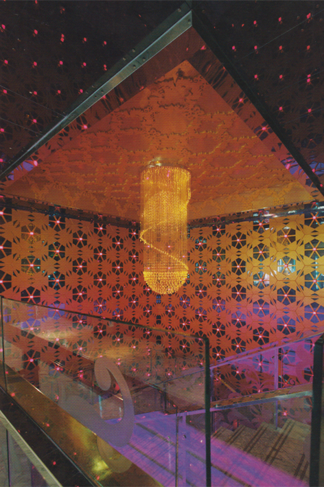 夜場(chǎng)設(shè)計(jì)巧妙地運(yùn)用了不斷排列的屏風(fēng)造型,將原大堂方正呆板的格局打破,規(guī)劃處精致的入口造景及安靜的電梯等候空間。走道上的轉(zhuǎn)折設(shè)計(jì),讓客人有移步換景的感覺。運(yùn)用裝飾手法,將提煉的歐式元素經(jīng)過有序的組合設(shè)計(jì),帶出低調(diào)奢華的感覺。平面的花葉圖案被賦予在銀色樹脂材質(zhì)上,如同煥發(fā)了生命力一般,在黑鏡上無限擴(kuò)張。傳統(tǒng)的符號(hào)與現(xiàn)代的材質(zhì)在這里找到了和諧。