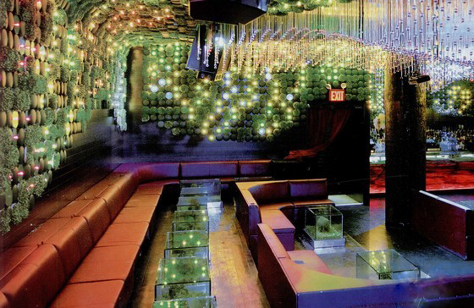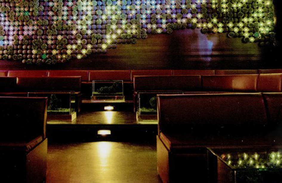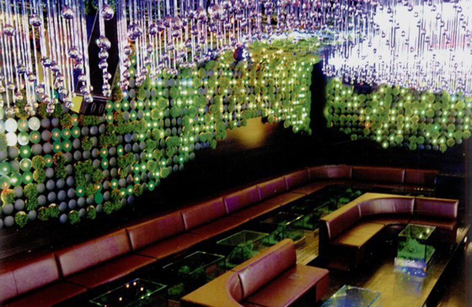 今天這個夜場設(shè)計理念是表達大自然作為一個生命系統(tǒng)的活力與華美。墻體與天花板經(jīng)由一系列激光切割的框架相連接,在空間內(nèi)搭建了一個“庇護所”,上面裝飾有一系列由六個小圓板組成的圖形經(jīng)過算法隨機排列生成的圖案。其中三分之一的圓板上貼有環(huán)保乙烯軟墊;另有三分之一上面覆蓋有可長期使用的黃楊木,其余的則被處理成漆面。每個圓盤上都裝有盞0。8瓦的高亮LED燈,總計2500盞燈都通過特制的程序加以控制,以實現(xiàn)富于變化的照明效果。這些L印燈可以跟隨音樂節(jié)奏或視頻信號變幻效果。最終為顧客提供一次體驗“生態(tài)景觀”的機會。整個設(shè)計方案中,桌子以一種多變的形態(tài)出現(xiàn),它是以金屬框架、黃楊木和鋼化玻璃為原料。玻璃盒內(nèi)的黃楊木被修剪成不同的動物形象,仿佛正在人造草坪似的地毯上休息。吧臺是設(shè)計師之前制作的一具景觀沙盤模型,由等比縮放的樹木和房屋組成,模型的細膩真實程度可以與自然景觀相媲美。對于商業(yè)性室內(nèi)設(shè)計來說,本案中難度最大的環(huán)節(jié)就是改造現(xiàn)有系統(tǒng)以符合“LEED-cI”綠色認(rèn)證中嚴(yán)格的效率要求。設(shè)計師在滿足這一需求的基礎(chǔ)上,也使項目的審美性能和品質(zhì)得以實現(xiàn)。