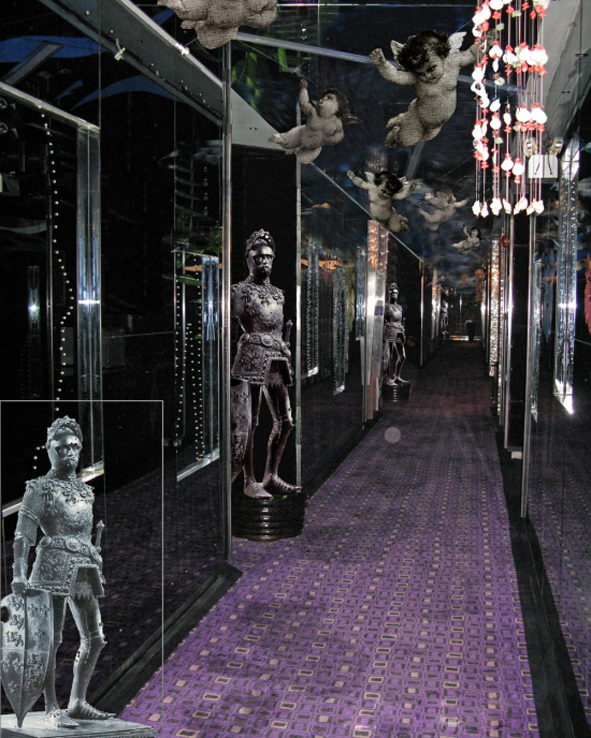 入口為羅馬廢舊場(chǎng)景:殘?jiān)珘Ρ诩氨粨p毀的科林斯柱式;頭戴皮帽、腳穿皮靴、身體裸露的大衛(wèi),手持鋼劍俯身低頭的情緒給了空間由電影“蒙太奇”的連續(xù)效果。